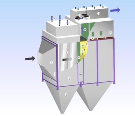 1.进气烟箱2. 灰斗3.壳体4 .收尘极5.振打装置6.导流装置7. 滤袋8.清灰系统9. 净气室