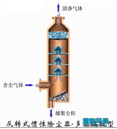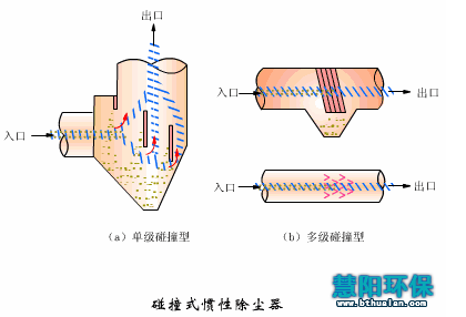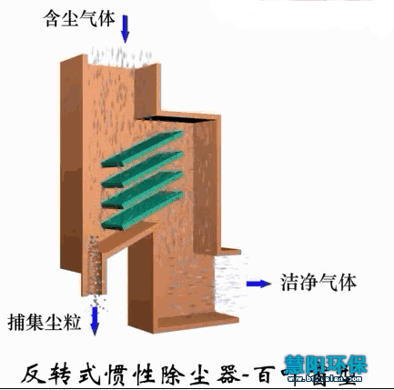 惯性除尘器分为碰撞式和回转式两种。前者是沿气流方向装设一道或多道挡板,含尘气体碰撞到挡板上使尘粒从气体中分离出来。显然,气体在撞到挡板之前速度越高,碰撞后越低,则携带的粉尘越少,除尘效率越高。后者是使含尘气体多次改变方向,在转向过程中把粉尘分离出来。气体转向的曲率半径越小。转向速度越多,则除尘效率越高。