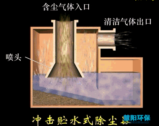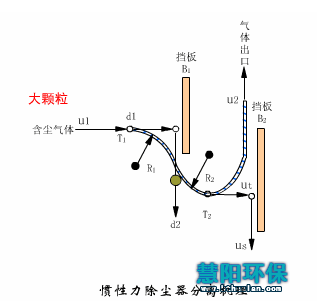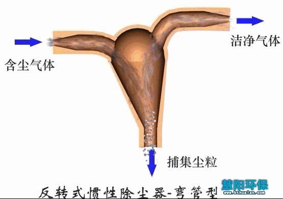 工作原理:利用粉尘与气体在运动中惯性力的不同,将粉尘从气体中分离出来。一般都是在含尘气流的前方设置某种形式的障碍物,使气流的方向急剧改变。此时粉尘由于惯性力比气体大得多,尘粒便脱离气流而被分离出来,净化的气体在急剧改变方向后排出。