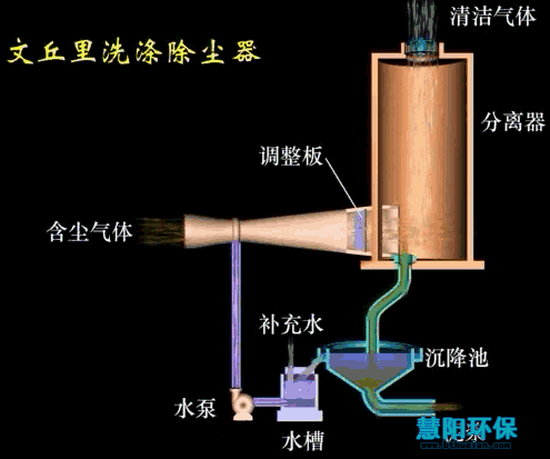主要由文丘里管(有收缩管、喉管和扩大管三部分)和旋风分离器组成。工作原理:含灰尘的气体进入收缩管,流速沿管逐渐增大。水或其他液体由喉管处喷入,被高速气流所撞击而雾化。气体中的尘粒与液滴接触而被润滑。进入扩大管后,流速逐渐减小,尘粒互相粘合,使颗粒增大而易除去。后进入旋风分离器,由于离心力的作用,水与润滑的尘粒被抛至分离器的内壁上并向下流出器外,净制后的气体则由分离器的管排出。其优点是结构简单,除尘。缺点是阻力大,不能用于净制不容许与液体接触的气体。除除尘外,还有降温作用。