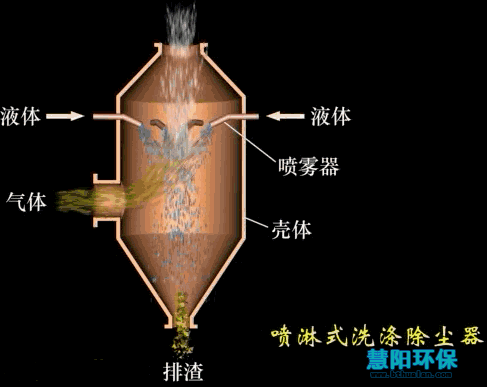 在逆流式喷雾塔中,含尘气体向上运动,液滴由喷嘴喷出向下运动。因液滴和颗粒之间的惯性碰撞、拦截和凝聚等作用,使较大的的粒子被液滴捕集。喷雾塔具有结构简单、压力损失小、操作稳定等特点,经常与洗涤器联用捕集粒径较大的颗粒。