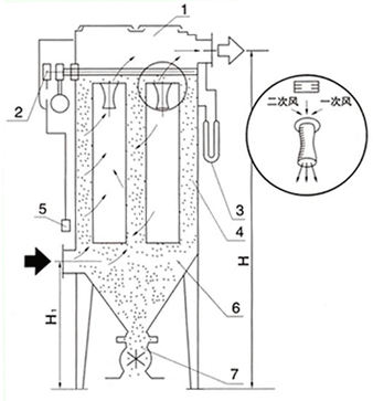 含尘气体由除尘器进风口进入中、下箱体、通过滤袋进入上箱体的过程中,由于滤袋的各种效应作用将粉尘气体分离开,粉尘被吸附在滤袋上,而气体穿过滤袋由文氏管进入上箱体,从出风口排出。含尘气体通过滤袋的净化过程中,随着时间的增加,积在滤袋上的粉尘越来越多,因而是滤袋的阻力逐渐增加,通过滤袋的气体量逐渐减少,为了是除尘器能正常工作,所以要把阻力控制在限定范围内(一般为120-150毫米水柱).这样当阻力升到限定范围的时候,有控制仪就要发出指令按顺序触发各控制阀开启脉冲阀,气包内的压缩空气由喷吹管各孔经文氏管喷射到各对应的滤袋内,滤袋在气流瞬间反向作用下急剧膨胀,使积在滤袋表面的粉尘脱落,滤袋。被掉的粉尘落入灰斗经排灰系统排出机体,由于积附在滤袋上的粉尘定期,被净化的气体正常通过,除尘器正常工作。