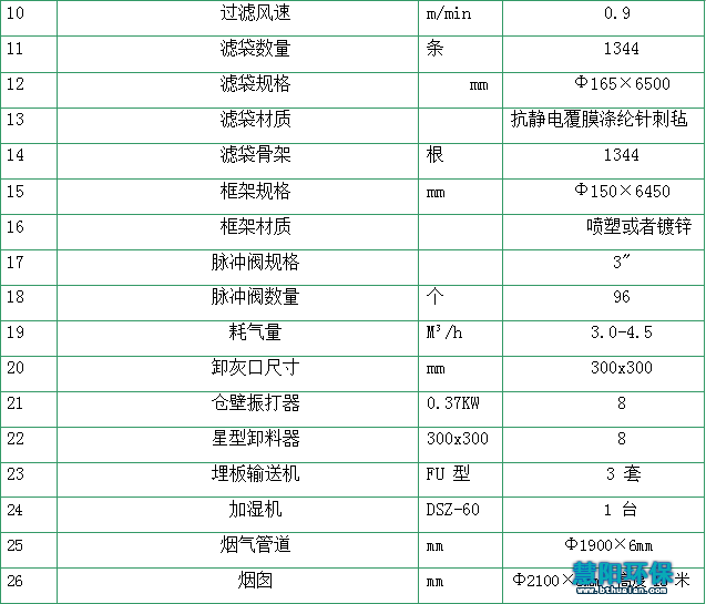 9、脉冲袋式除尘器技术参数表(2×63孔4.3米捣固焦炉,2×60孔5.5米捣固焦炉)