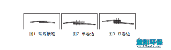 对于玻纤覆膜滤袋,主要是由纵横交错的机织滤料作为基材,边口的经纱、纬纱极易松散脱落,若使用图1所示的常规接缝,则边口纱线容易脱落,甚至导致接缝松脱。因此,采用图3所示的双卷边缝制方式,将两侧边口均隐藏在接缝内部,防止边口的玻纤纱线脱落导致接缝松脱的现象。对于普通针刺毡覆膜滤袋,其基材是非织造材料,没有经纱、纬纱的机织结构,边口不易松散脱落,因此可以采用图1所示的常规接缝方式进行缝制。对于食品、医药等行业,为了避免覆膜滤袋接缝上的滤料纤维掉入回收料中,针刺毡覆膜滤袋须采用图2所示的单卷边方式进行缝制,将迎尘面一侧的毛边隐藏在滤袋内部。其实从和质量角度,采用图3所示的双卷边方式缝制是好的选择,因为这样既可边口的纤维或纱线不会混入粉尘中,又可接缝缝合的强度,不易松脱。但在客观条件允许的情况下,采用图1所示的常规接缝则是节约成本的方式,并且由于普通针刺毡覆膜滤料比玻纤覆膜滤料厚得多,如果也采用图3所示的双卷边方式缝制,则接缝会因太厚而无法缝制。因此,接缝形式的选择还应视滤料的材质和应用的场合等具体情况而定。
