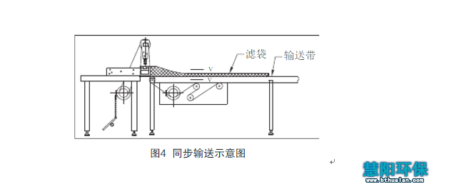 ——在覆膜滤袋的缝制过程中,特别注意对滤料表层薄膜的保护,尽大可能避免损伤。在外滤式袋身的三线链式缝制过程中,由于是直缝缝制,袋身会被推到操作台面,这样,滤袋的覆膜表面与操作台面间会形成摩擦,并极有可能损伤覆膜。为了解决这一问题,应采用与缝制速度相匹配的同步输送装置。该装置与缝纫机的启停同步,即缝纫机工作与侧输送带的速度匹配,使滤袋的覆膜表面与输送带表面之间相对静止,避免了摩擦损坏。当缝纫机停止工作时,则输送带也同步停止(如图4所示)。