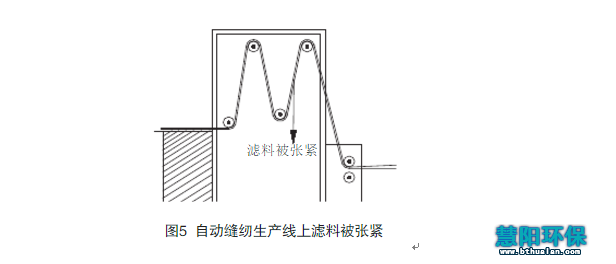 ——随着缝制技术的发展,目前滤袋缝制也有了全自动生产的缝纫设备,一旦初步调试完成,缝制过程中很少需要人工操作了。在一般毡料滤袋的缝制中可广泛应用。但在缝制覆膜滤袋时,则要谨慎使用自动缝纫设备。因为,在自动缝纫设备上,滤袋在缝制之前是需要张紧成型的(如图5所示),在设置这个张紧力时特别需要考虑到对滤料表层覆膜的保护,否则极易造成覆膜因张力过大或与张紧辊摩擦而破损。