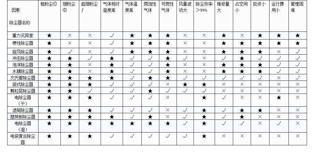 所有除尘器的共同特点是粉尘越细、密度越小,就越难捕集,粉尘二次飞扬也越严重。所以粉尘的分散度和密度对除尘器的性能影响很大。即使分散度和密度相同,而且选用的除尘器也一样,但是由于操作条件不同也有很大差异。如果一般粉尘密度较大,而且粒径>10μm,除尘效率要求也不很高,就可选用重力除尘器、惯性除尘器或旋风除尘器。相反粒径小于几微米,或真密度ρz和堆积密度ρd之比>10的粉尘,应选用的电除尘器或袋式除尘器。选用时可根据常用除尘器的类型和性能进行zui后选定。