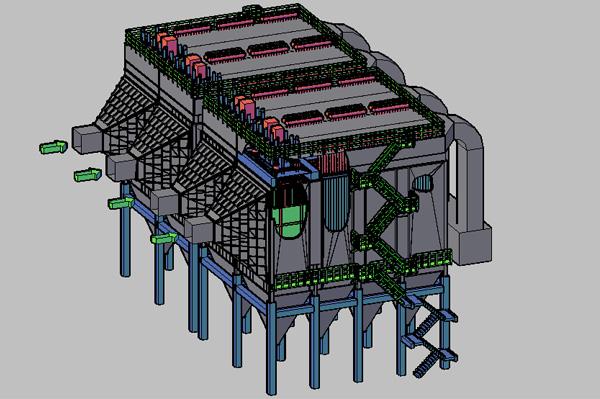 2.1.3 本着节省投资的原则,充分利用现有设备。原电除尘支柱、壳体、进出气烟箱不动;对壳体内进气口气流分布板、第1电场阴阳极系统、振打系统作检修、调整;对电场的电控系统不动作检修、调整。拆除第2、3电场阴阳极系统、振打系统,将其布置成布袋除尘区;拆除二、三电场原电控系统,改换为布袋电控系统。