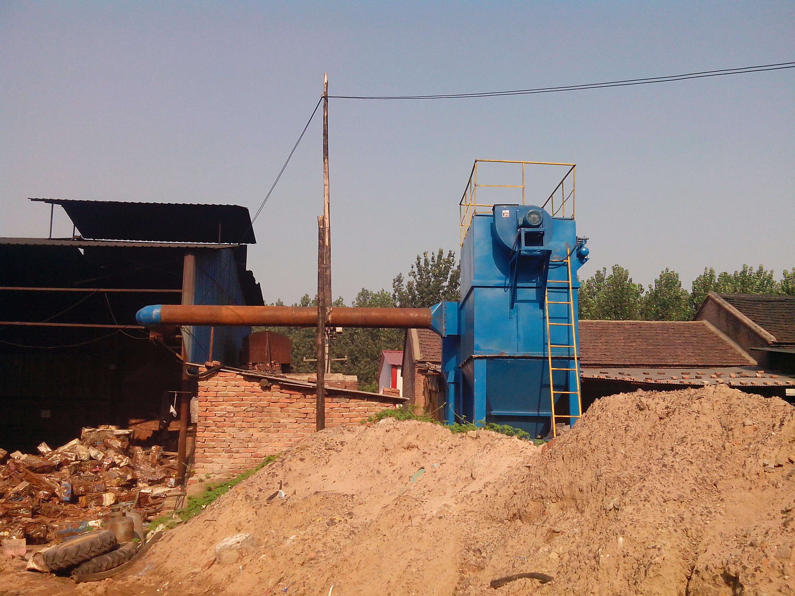 7、采用的布袋除尘器是底部进风结构,并设有预收尘机构,不但克服了粉尘直接冲刷磨损布袋的缺点,而且提高了收尘效果。