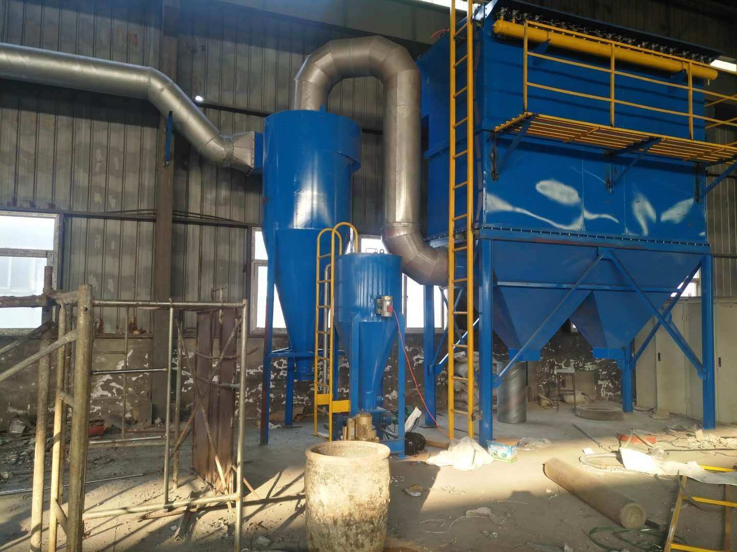 慧阳1T中频电炉除尘器设计采用旋转式集气罩,根据总风量和粉尘性质设计出吸尘主管道和产生的风量,选用120单机布袋除尘器以、、长期稳定运行。
