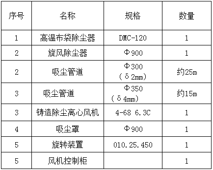 (3)产生风量的计算是根据粉尘特点及吸尘罩的截面尺寸,经计算1台中频炉吸尘罩产生的风量约为10000m3/h(取风罩断面风速为1.5m/s)。