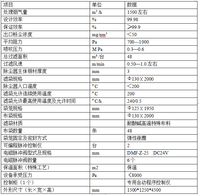 慧阳小型锅炉脉冲喷吹袋式除尘器技术规格表