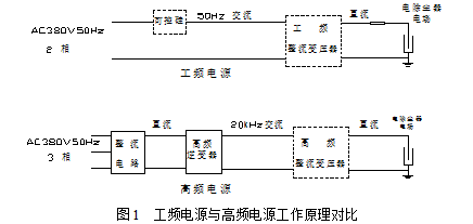 此高频高压整流电源是将三相交流电经整流和滤波后产生580V左右的直流电压,由IGBT全桥逆变,经谐振电容震荡产生 高20KHz交变电流,再经高频变压器升压整流后形成高频高压脉动直流送入电除尘器。改造前的工频电源与改造后的高频电源工作原理对比如下图一所示: