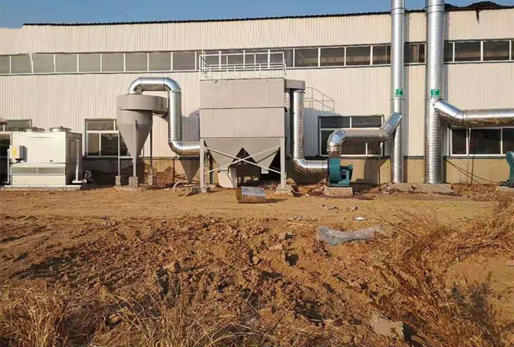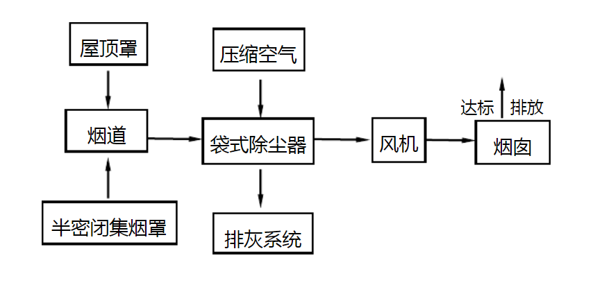 铸造厂除尘器系统由烟气捕集器、烟道、除尘器、风机、排灰装置、烟囱及电气控制组成。流程为:烟气经捕集器进入烟道,在足够长的烟道中温度降低到滤袋允许温度后进入袋式除尘器,在除尘器中烟气与粉尘分离,净化后的烟气经风机、烟囱排入大气,收集的粉尘由排灰装置排出。