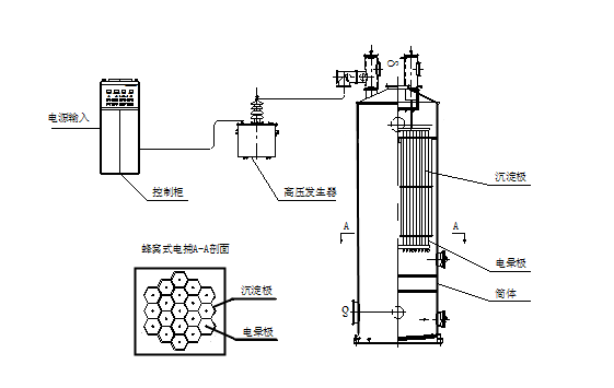 蜂窝式电捕焦油器主要两大部分组成,由捕焦本体(机械塔体)、高压直流电源,前者结构由蜂窝状沉淀极系统、放电极(电晕线)绝缘箱组成,后者选用GGAj系列恒流型高压直流电源控制供电和输电等设备组成。