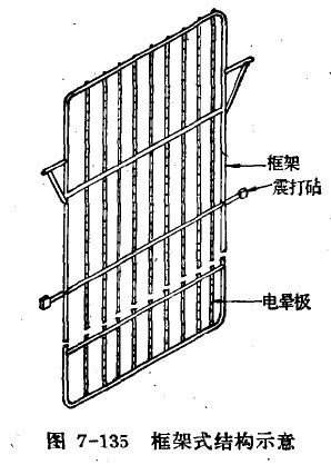 图为框架式结构示意。它分成几段,每段极线长度一般不超过2.5米左右。这样极线较短,可以限制其摆动。 高压电极依靠绝缘子保持对沉降器壳体和收尘电极绝缘。这些