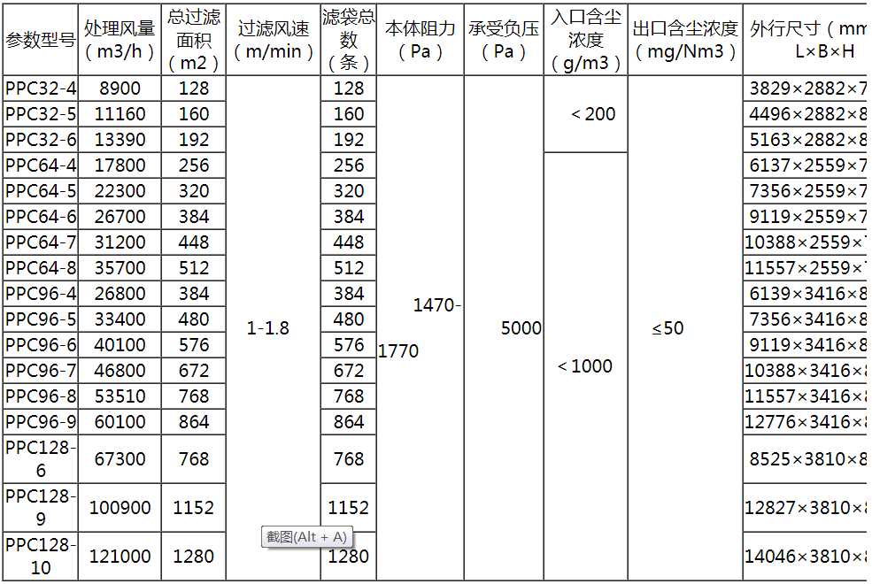 本系列产品共有33种规格,每室的袋有32、64、96、128袋四种,除尘滤袋长度有2450mm和3060mm两种,收尘效率可达90%以上,净化后气体的含尘浓度小于100mg/m3(标)本系列布袋除尘器如用于寒冷地区,当室外采暖计算温度≤-25℃时,要设热装置。